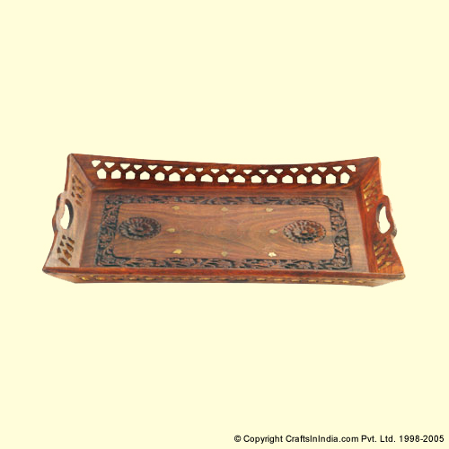 Wooden Tray with Carving and Brass Inlay