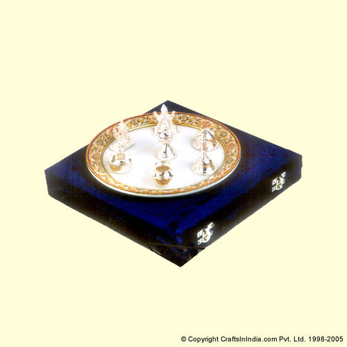 This marble thali has a border that is beautifully decorated with Rajasthani work in 24-carat gold. The marble thali is accompanied by silver images of Goddess Lakshmi and Lord Ganesha and lightweight utensils in silver, to fulfill all your prayer needs. There is a prayer bell, a lota, a holder for incense sticks, two katoris and a diya, all made of silver, to complete your set of prayer items. It’s the perfect gift for an auspicious occasion, or at any time of the year.